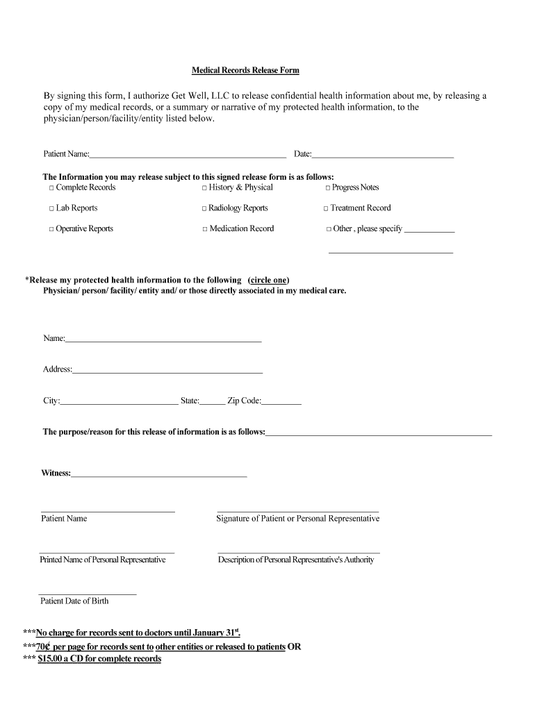 Medical Records Release Form By signing this form, I authorize Get Well, LLC to release confidential health information about me, by releasing a copy of my medical records, or a summary or narrative