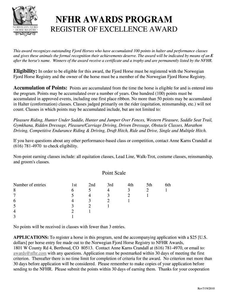 This award recognizes outstanding Fjord Horses who have accumulated 100 points in halter and performance classes and gives these animals the formal recognition their achievements deserve. The award