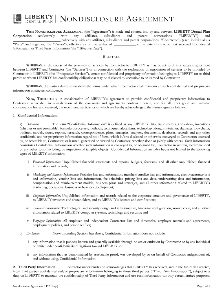 LIBERTY DENTAL PLAN N NONDISCLOSURE A AGREEMENT THIS NONDISCLOSURE AGREEMENT (the Agreement) is made and entered into by and between LIBERTY Dental Plan Corporation (collectively with any affiliates,