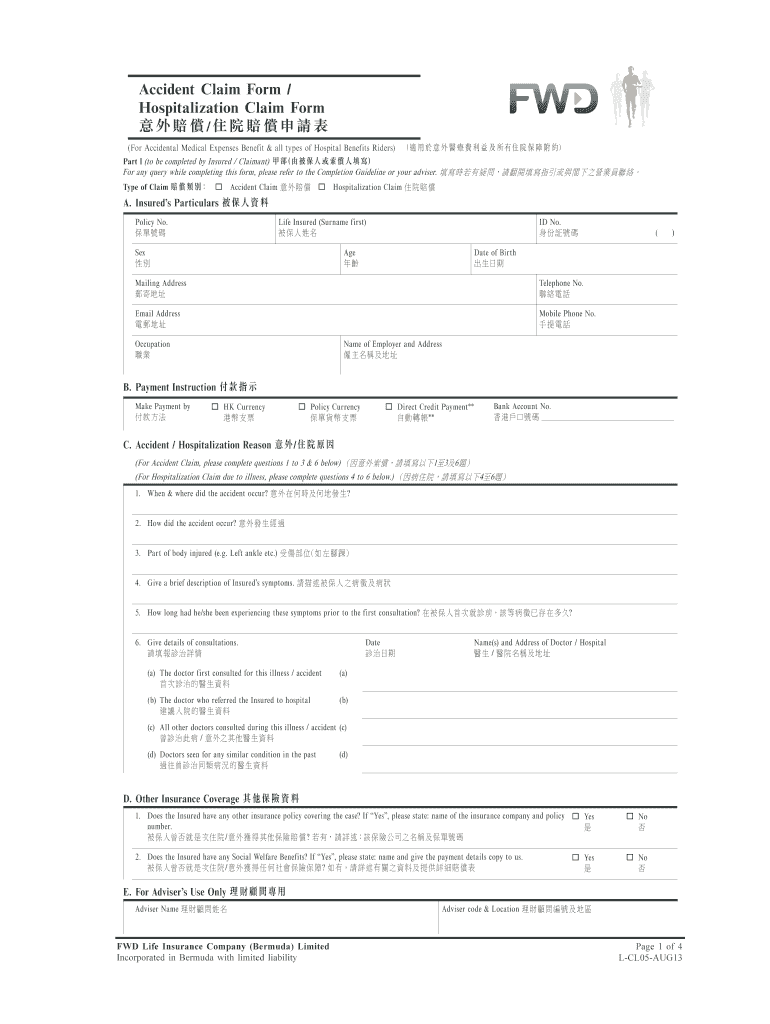 Accident Claim Form / Hospitalization Claim Form (For Accidental Medical Expenses Benefit & all types of Hospital Benefits Riders) Part I (to be completed by Insured / Claimant) For any query while
