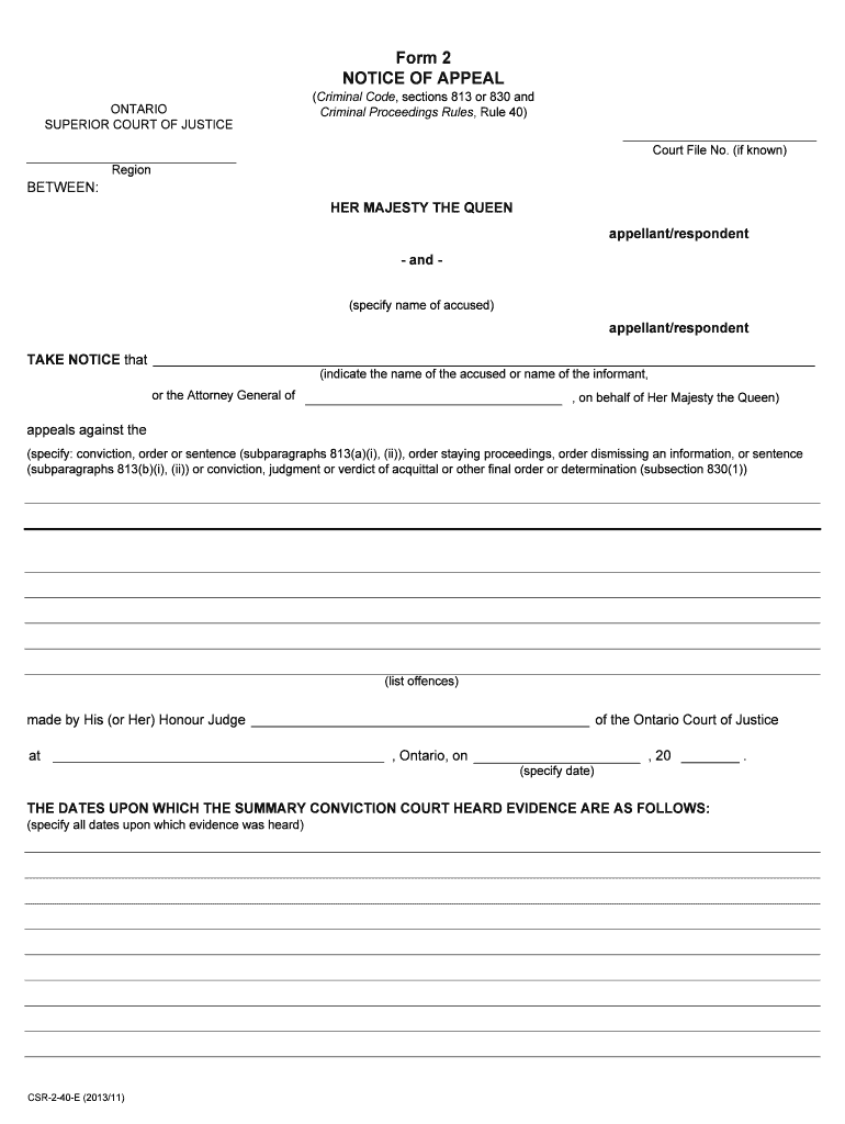 Form 2 NOTICE OF APPEAL ONTARIO SUPERIOR COURT OF JUSTICE (Criminal Code, sections 813 or 830 and Criminal Proceedings Rules, Rule 40) Court File No. (if known) BETWEEN: Region HER MAJESTY THE QUEEN