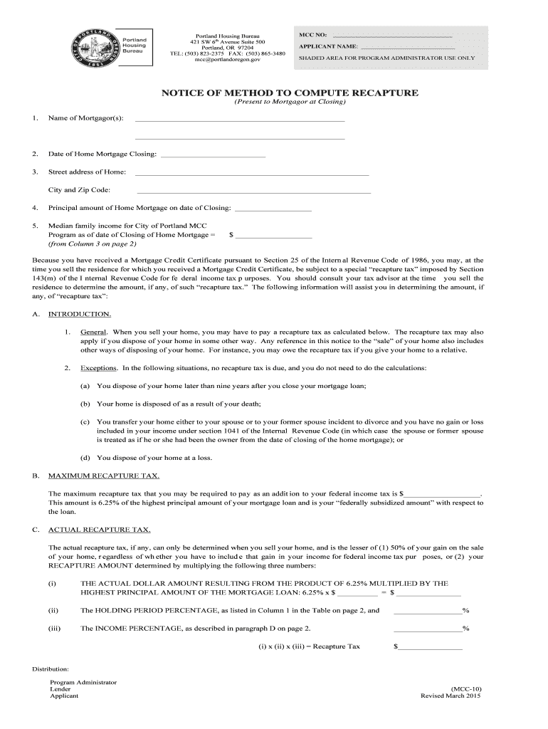 Portland Housing Bureau 421 SW 6th Avenue Suite 500 Portland, OR 97204 TEL: (503) 8232375 FAX: (503) 8653480 MCC portlandoregon.gov MCC NO: APPLICANT NAME: SHADED AREA FOR PROGRAM ADMINISTRATOR USE