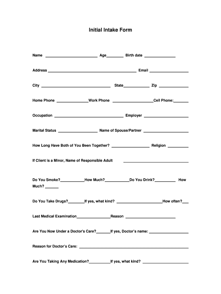 Initial Intake Form Name Age Birth date Email Address State City Home Phone Zip Work Phone Cell Phone: Employer Occupation Name of Spouse/Partner Marital Status Religion How Long Have Both of You