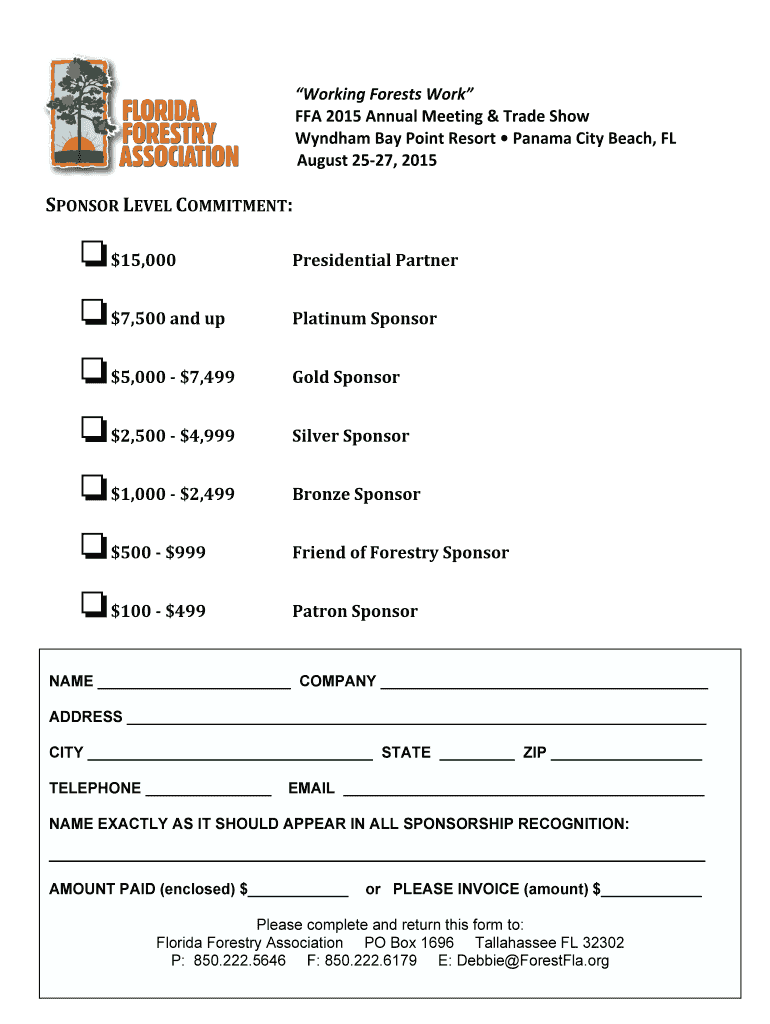Working Forests Work FFA 2015 Annual Meeting & Trade Show Wyndham Bay Point Resort Panama City Beach, FL August 2527, 2015 SPONSOR LEVEL COMMITMENT: $$15,0007,500 and up Presidential Partner Platinum
