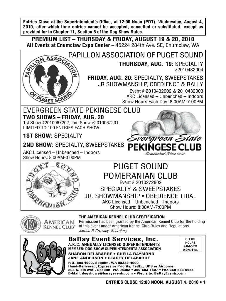 This document serves as the premium list for the Papillon Association of Puget Sound dog show events, detailing entry rules, event schedules, judges, entry fees, and other essential information for