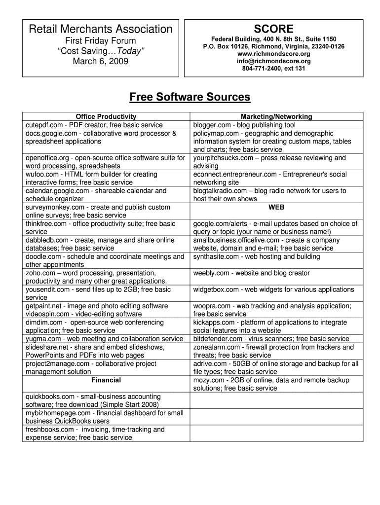 Retail Merchants AssociationSCOREFirst Friday Forum Cost SavingToday March 6, 2009Federal Building, 400 N. 8th St., Suite 1150 P.O. Box 10126, Richmond, Virginia, 232400126 www.richmondscore.org info