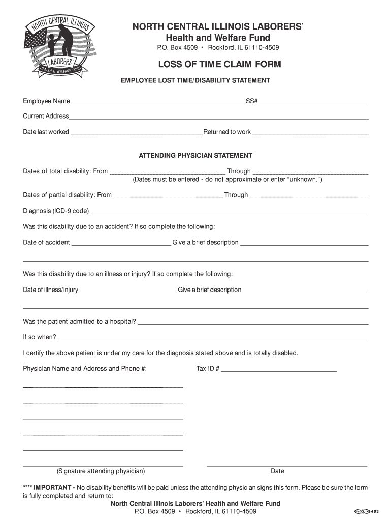 NORTH CENTRAL ILLINOIS LABORERS Health and Welfare Fund P.O. Box 4509 Rockford, IL 611104509 LOSS OF TIME CLAIM FORM EMPLOYEE LOST TIME/DISABILITY STATEMENT Employee Name SS# Current Address Date