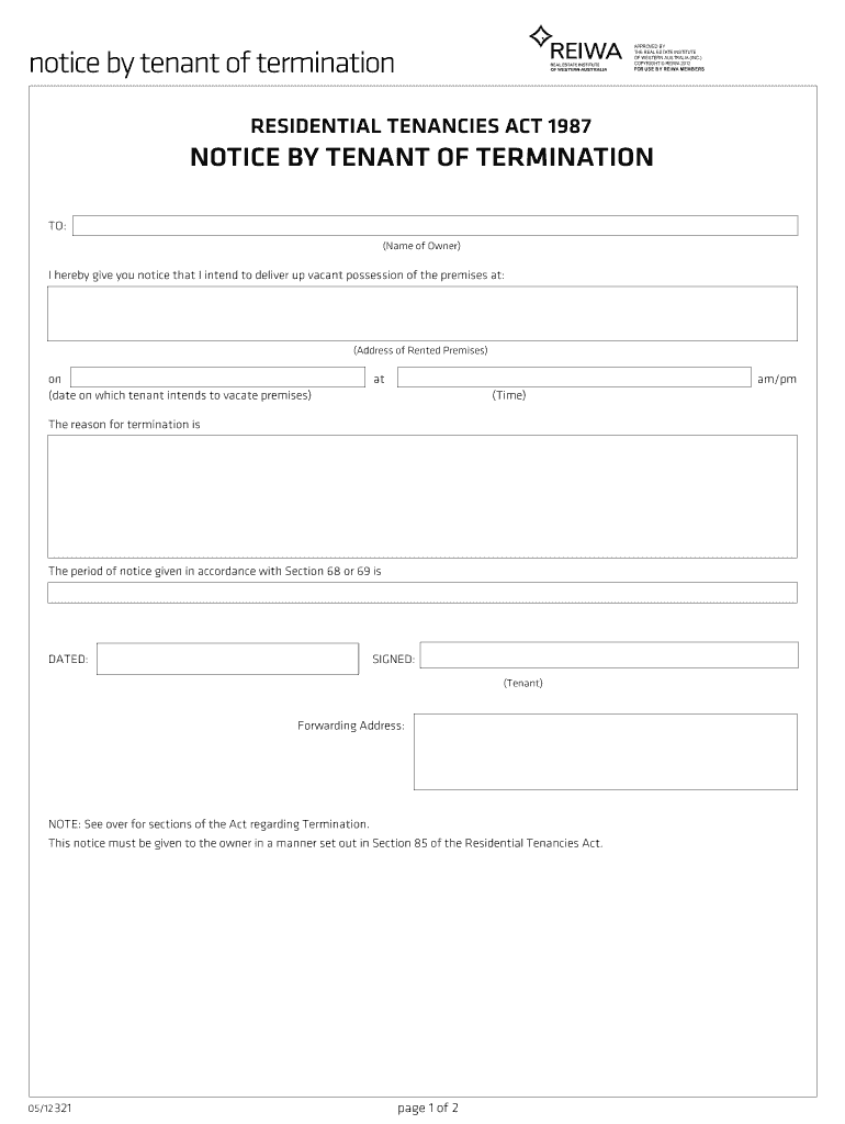 APPROVED BY THE REAL ESTATE INSTITUTE OF WESTERN AUSTRALIA (INC.) COPYRIGHT REI WA 2012 FOR USE B Y REI WA MEMO ERS notice by tenant of termination RESIDENTIAL TENANCIES ACT 1987 NOTICE BY TENANT