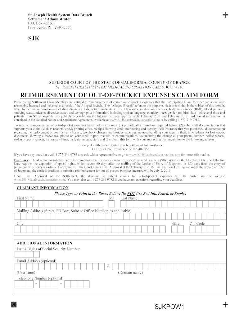 St. Joseph Health System Data Breach Settlement Administrator P.O. Box 43356 Providence, RI 029403356 SK SUPERIOR COURT OF THE STATE OF CALIFORNIA, COUNTY OF ORANGE ST. JOSEPH HEALTH SYSTEM MEDICAL