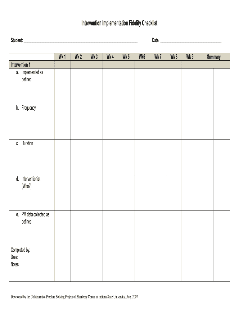 Intervention Implementation Fidelity Checklist Student: Wk 1 Wk 2 Wk 3 Wk 4 Wk 5 Intervention 1 a. Implemented as defined b. Frequency c. Duration d. Interventionist (Who?) e. PM data collected as