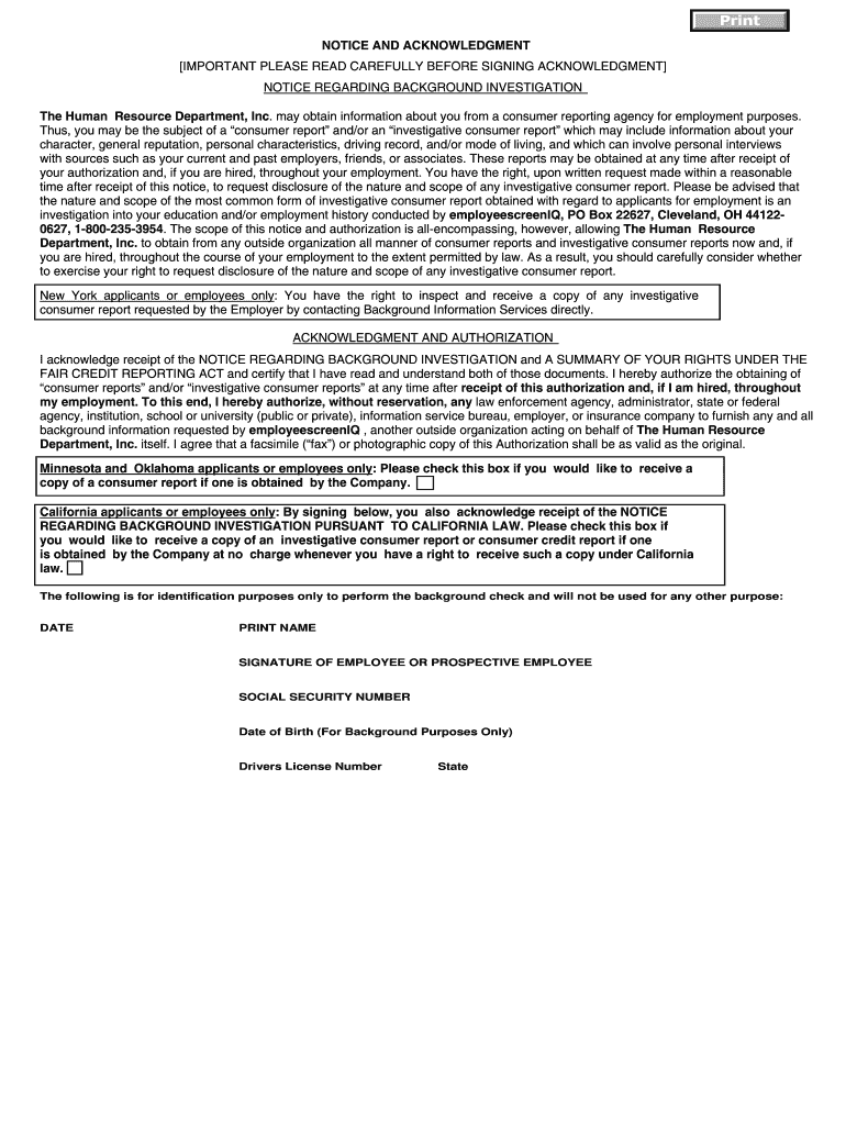 Print NOTICE AND ACKNOWLEDGMENT IMPORTANT PLEASE READ CAREFULLY BEFORE SIGNING ACKNOWLEDGMENT NOTICE REGARDING BACKGROUND INVESTIGATION The Human Resource Department, Inc. may obtain information about