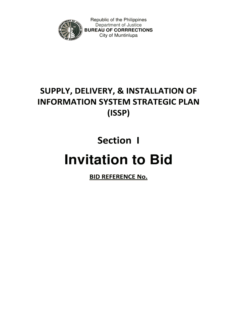 Republic of the Philippines Department of Justice BUREAU OF CORRECTIONS City of Muntinlupa SUPPLY, DELIVERY, & INSTALLATION OF INFORMATION SYSTEM STRATEGIC PLAN (ISP) Section I Invitation to Bid REFERENCE
