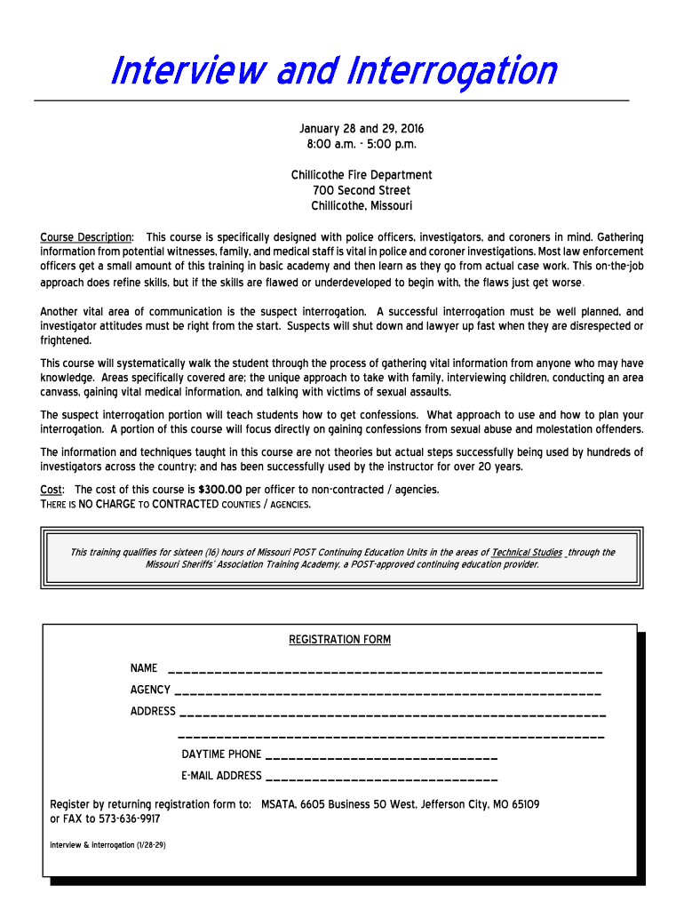 Interview and Interrogation January 28 and 29, 2016 8:00 a.m. 5:00 p.m. Chillicothe Fire Department 700 Second Street Chillicothe, Missouri Course Description: This course is specifically designed