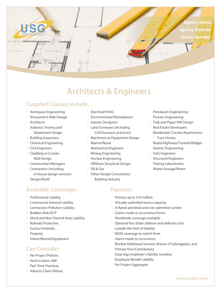 Agency Name USG Agency Website Insurance Services, Inc. Phone Number Architects & Engineers Targeted Classes Include: Aerospace Engineering Amusement Ride Design Architects Asbestos Testing and Abatement
