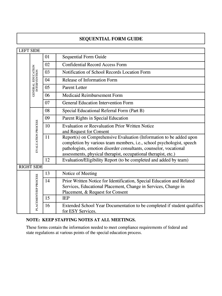 SEQUENTIAL FORM GUIDE LEFT SIDE 02 Confidential Record Access Form 03 Notification of School Records Location Form 04 Release of Information Form 05 Parent Letter 06 Medicaid Reimbursement Form General