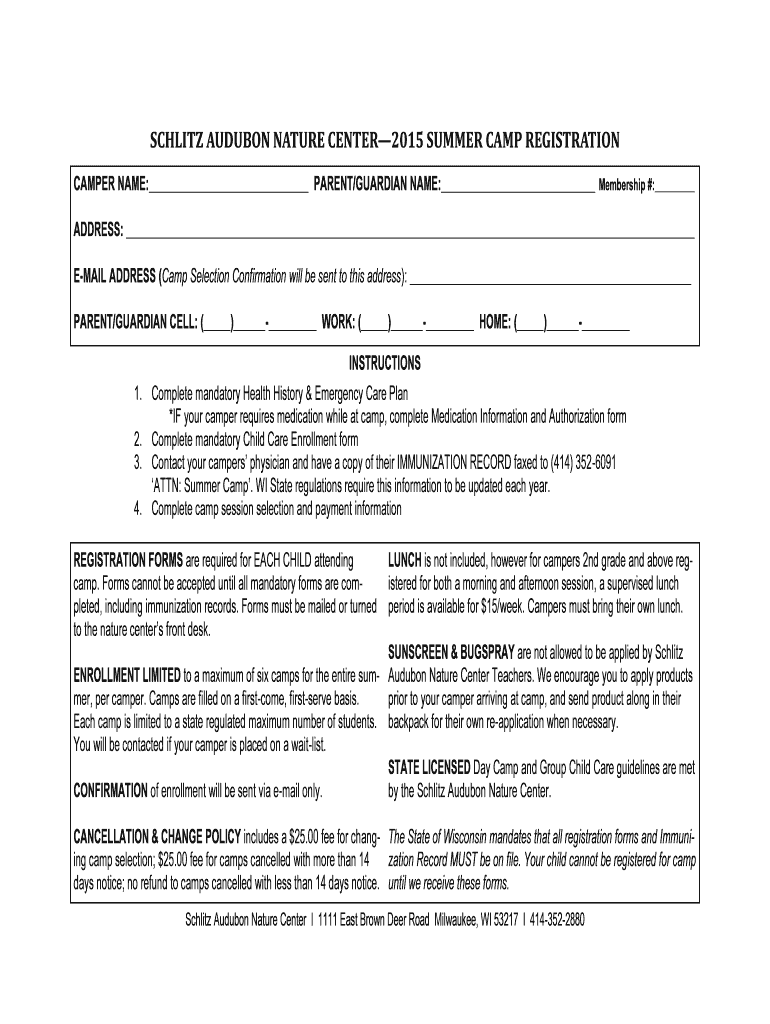 Get the free SCHLITZ AUDUBON NATURE CENTER2015 SUMMER CAMP REGISTRATION CAMPER NAME: PARENT/GUARD...