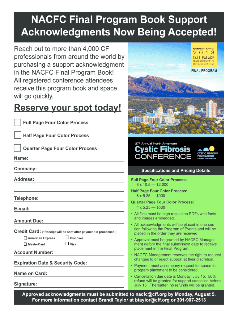 NAC FC Final Program Book Support Acknowledgments Now Being Accepted! Reach out to more than 4,000 CF professionals from around the world by purchasing a support acknowledgment in the NAC FC Final