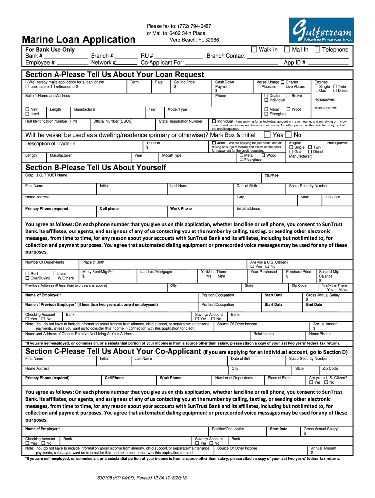 Please fax to: (772) 7940487 or Mail to: 6462 34th Place Vero Beach, FL 32966 Marine Loan Application For Bank Use Only Bank # Employee # Walking Branch # Network # RU # Applicant For: Mailing Telephone