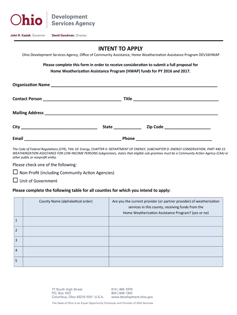 INTENT TO APPLY Ohio Development Services Agency, Office of Community Assistance, Home Weatherization Assistance Program DEV16HWAP Please complete this form in order to receive consideration to submit