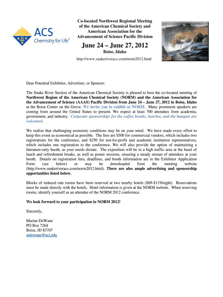 Colocated Northwest Regional Meeting of the American Chemical Society and American Association for the Advancement of Science Pacific Division June 24 June 27, 2012, Boise, Idaho http://www.snakeriveracs.com/norm2012.html