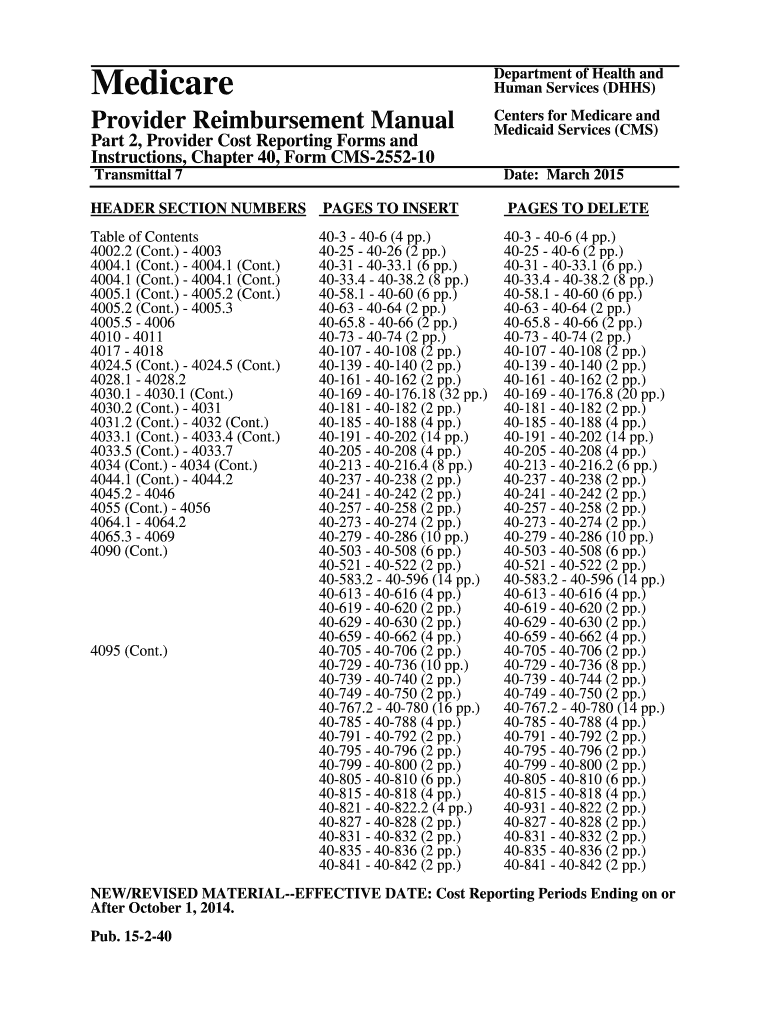 MedicareDepartment of Health and Human Services (HHS)Provider Reimbursement ManualCenters for Medicare and Medicaid Services (CMS)Part 2, Provider Cost Reporting Forms and Instructions, Chapter 40,