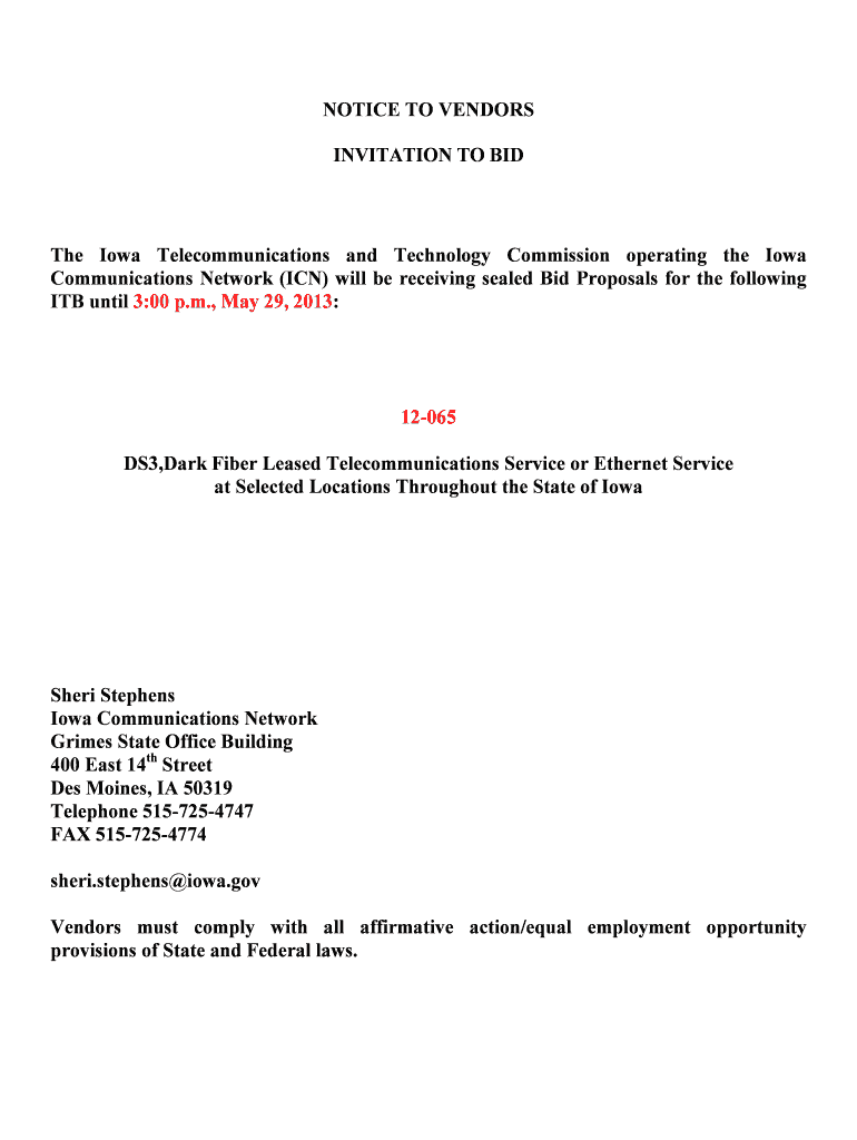 NOTICE TO VENDORS INVITATION TO BID The Iowa Telecommunications and Technology Commission operating the Iowa Communications Network (ICN) will be receiving sealed Bid Proposals for the following ITB