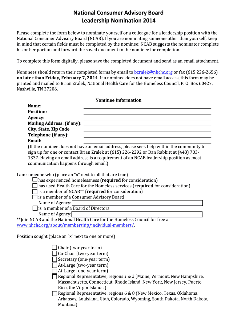 Get the free National Consumer Advisory Board Leadership Nomination 2014 - nhchc