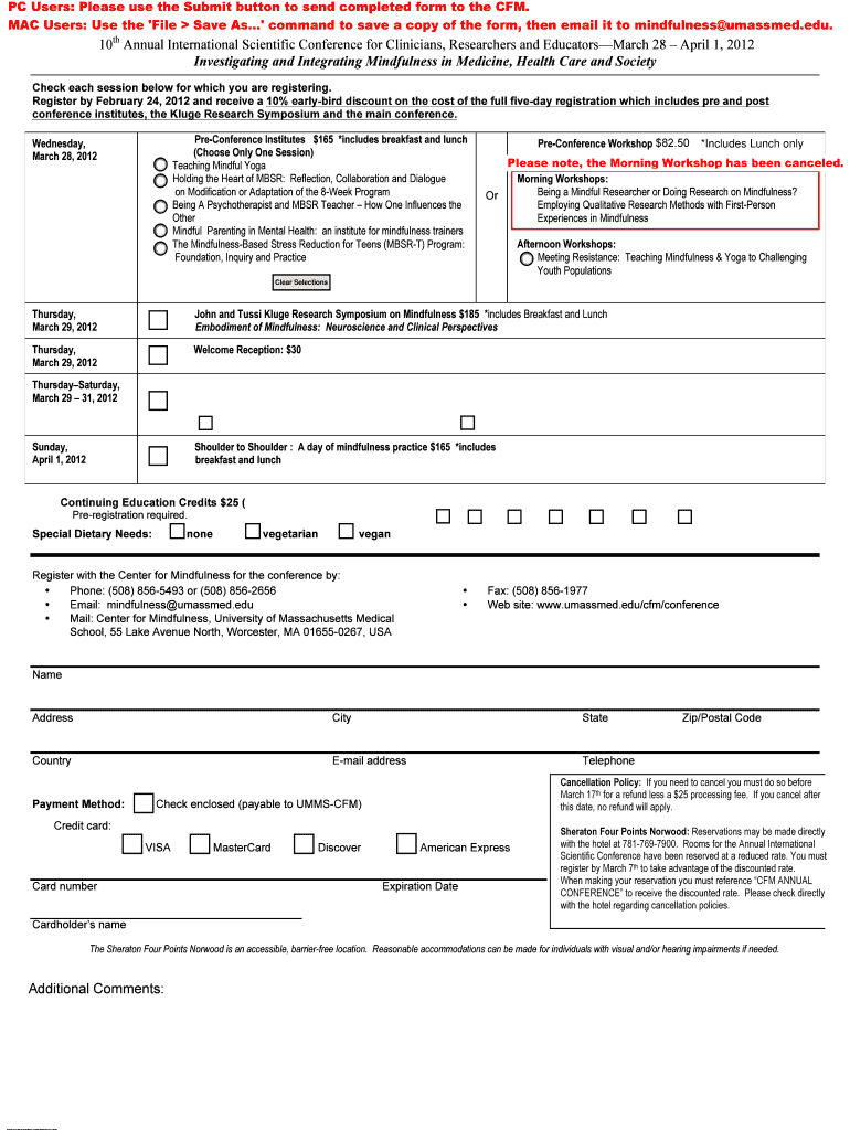 PC Users: Please use the Submit button to send completed form to the CFM. MAC Users: Use the 'File Save As... command to save a copy of the form, then email it to mindfulness amassed.edu. 10th Annual