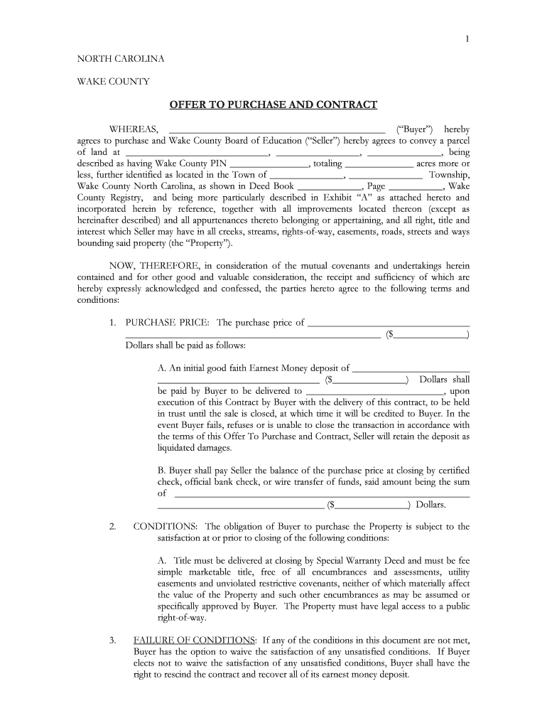 1 NORTH CAROLINA WAKE COUNTY OFFER TO PURCHASE AND CONTRACT WHEREAS, (Buyer) hereby agrees to purchase and Wake County Board of Education (Seller) hereby agrees to convey a parcel of land at, ,, being