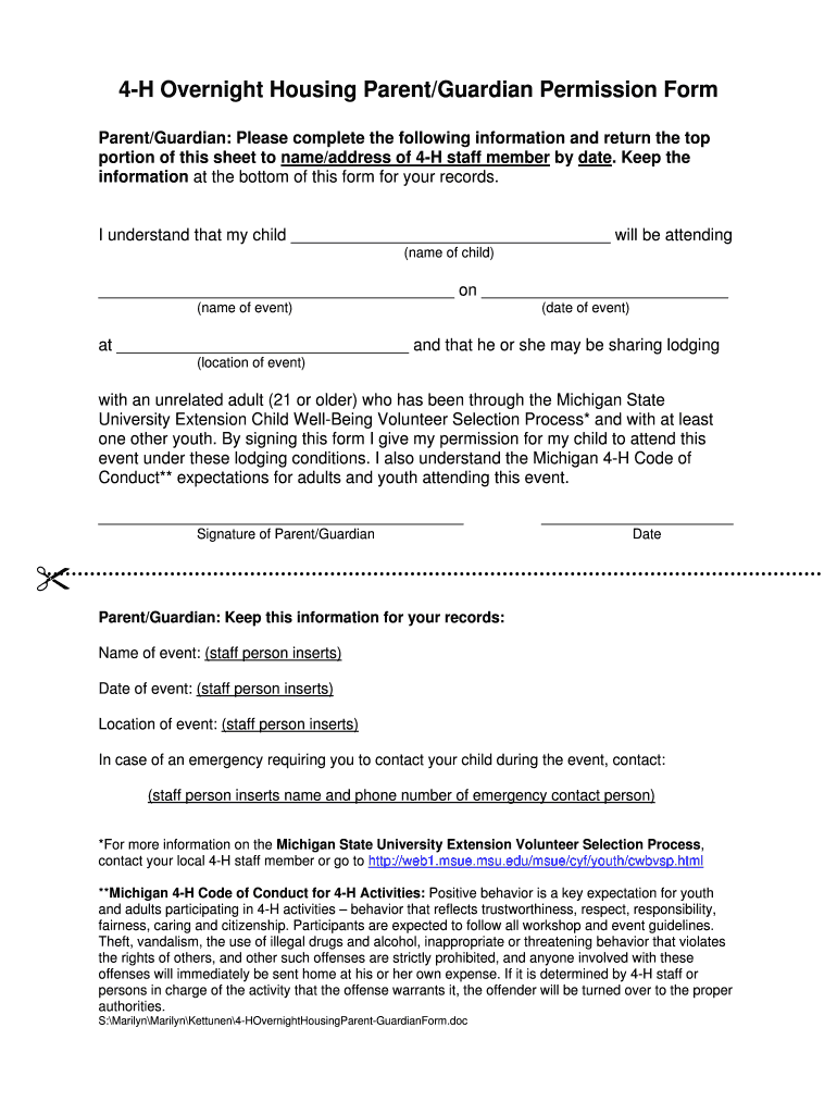 4H Overnight Housing Parent/Guardian Permission Form Parent/Guardian: Please complete the following information and return the top portion of this sheet to name/address of 4H staff member by date.