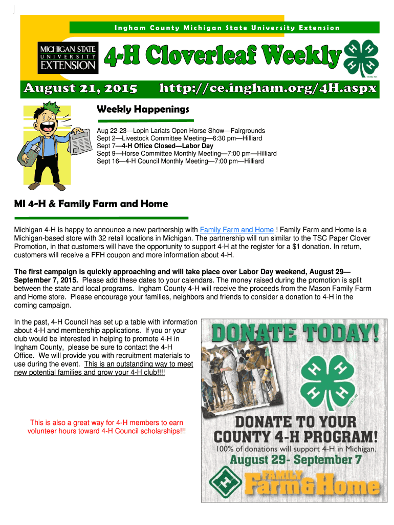 Ingham County Michigan State University Extension Weekly Happenings Aug 2223Lopin Lariats Open Horse ShowFairgrounds Sept 2Livestock Committee Meeting6:30 milliard Sept 74H Office ClosedLabor Day