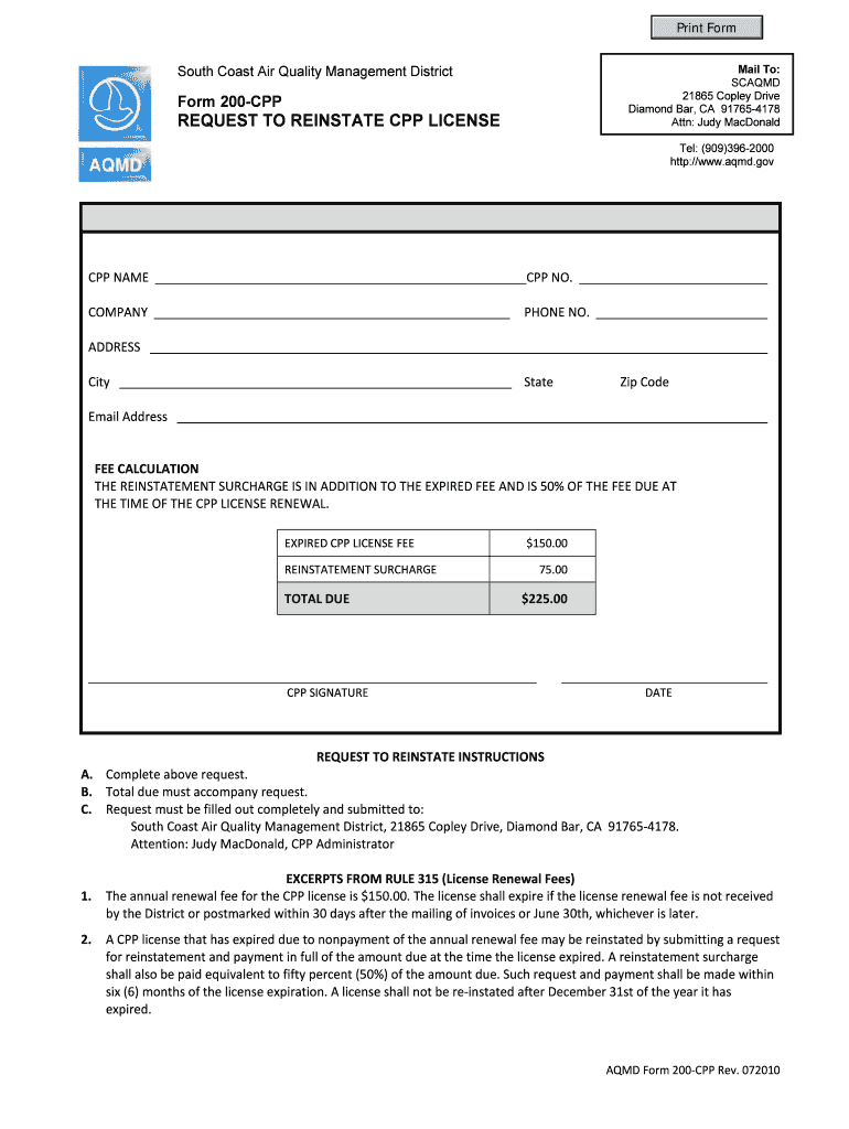 Print Form Mail To: SCALED 21865 Copley Drive Diamond Bar, CA 917654178 Attn: Judy MacDonald South Coast Air Quality Management District Form 200CPP REQUEST TO REINSTATE CPP LICENSE Tel: (909)3962000