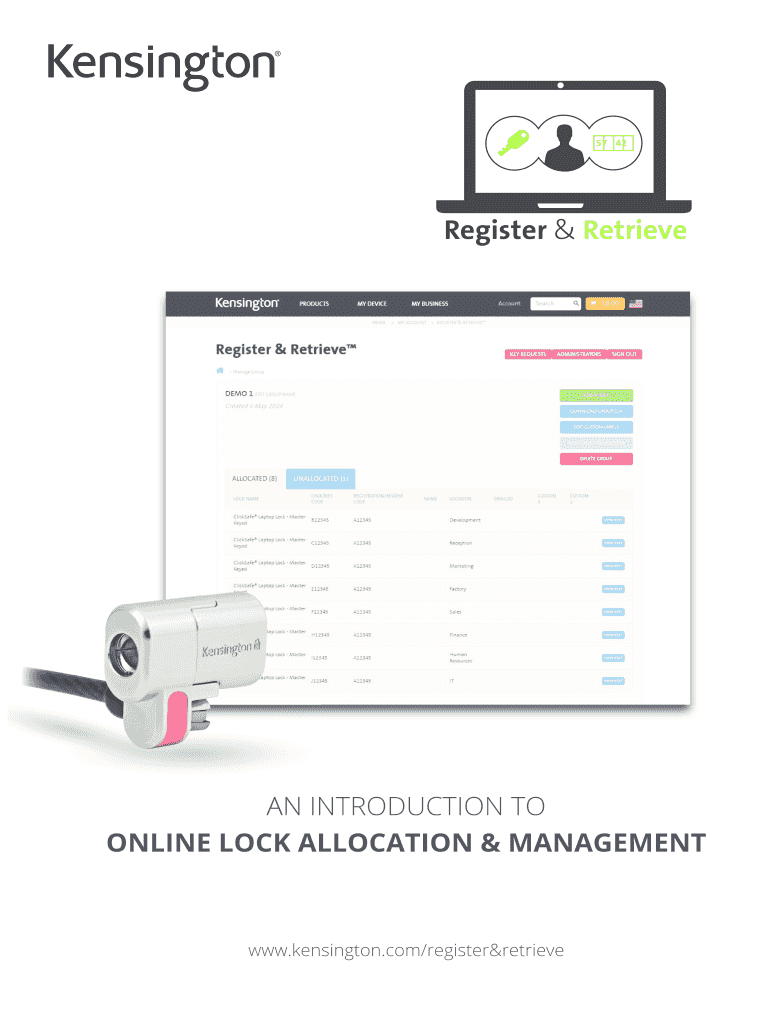 57 42Register & Retrieve AN INTRODUCTION TO ONLINE LOCK ALLOCATION & MANAGEMENTwww.kensington.com/register&retrieveWHAT IS REGISTER & RETRIEVE TM? Register & Retrieve TM empowers administrators in
