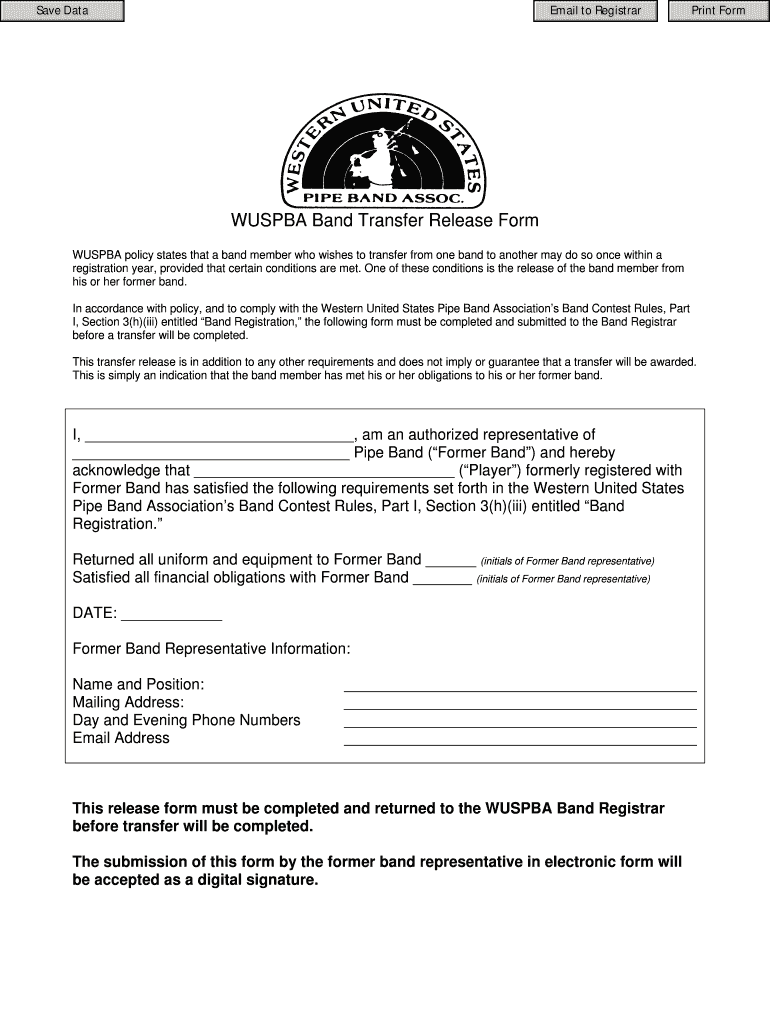 Save Data Email to Registrar Print Form RSPBA Band Transfer Release Form RSPBA policy states that a band member who wishes to transfer from one band to another may do so once within a registration