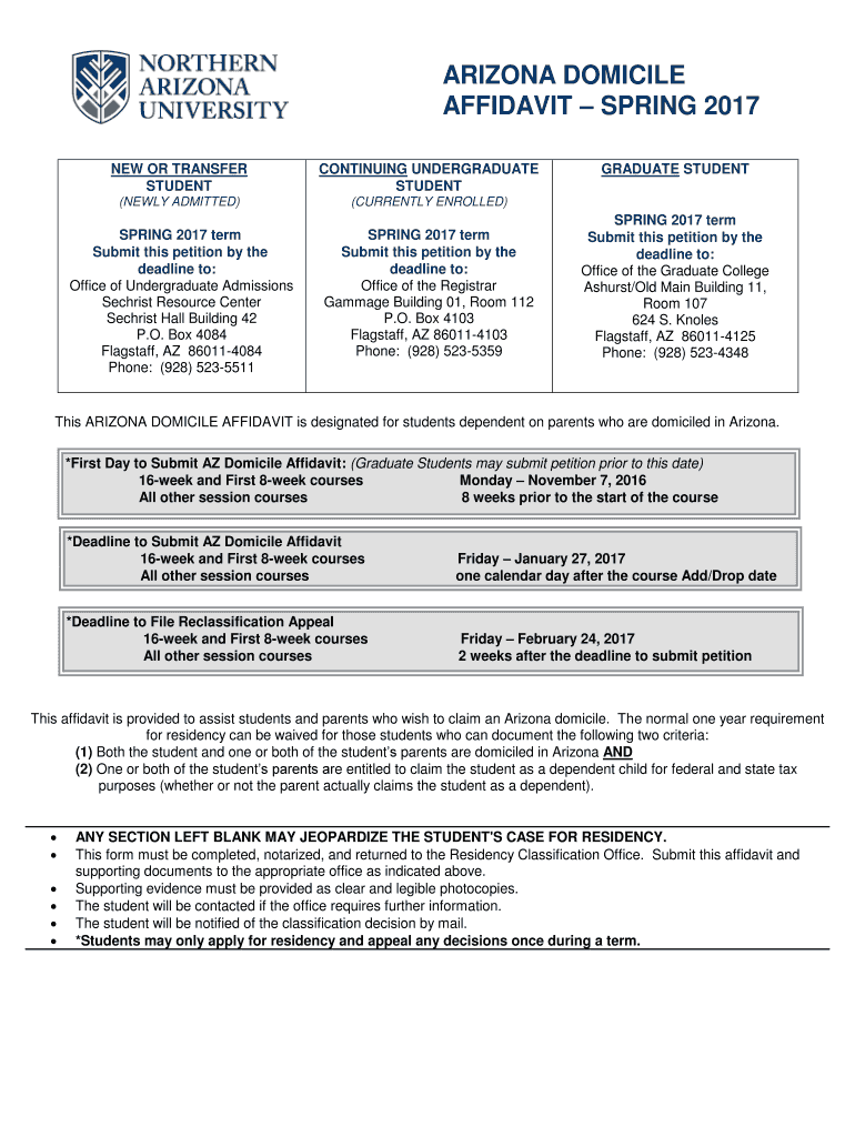 ARIZONA DOMICILE AFFIDAVIT SPRING 2017 NEW OR TRANSFER STUDENT CONTINUING UNDERGRADUATE STUDENT (NEWLY ADMITTED) (CURRENTLY ENROLLED) SPRING 2017 term Submit this petition by the deadline to: Office