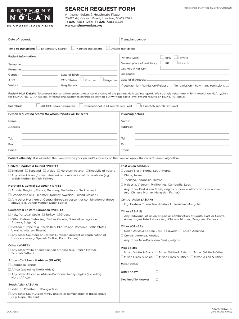 SEARCH REQUEST FORM Registered charity no 803716/SC038827 Anthony Nolan, 2 Heath gate Place, 7587 Agincourt Road, London, NW3 2NU T: 020 7284 1234 F: 020 7284 8226 www.anthonynolan.org Transplant