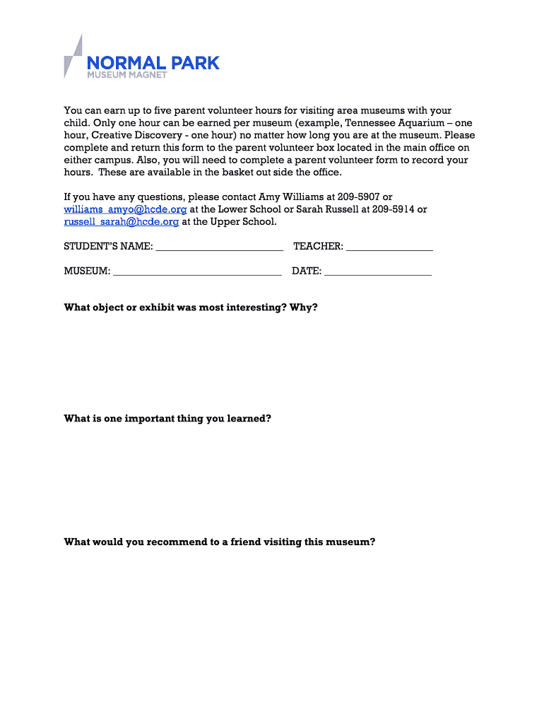 You can earn up to five parent volunteer hours for visiting area museums with your child. Only one hour can be earned per museum (example, Tennessee Aquarium one hour, Creative Discovery one hour)