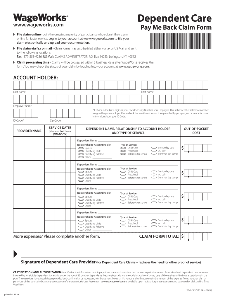 Dependent Care www.wageworks.com Claim Filing Options: How to File a Claim for Approval Dependent Care www.wageworks.com File claim online Log in to your account at www.wageworks.com to submit the