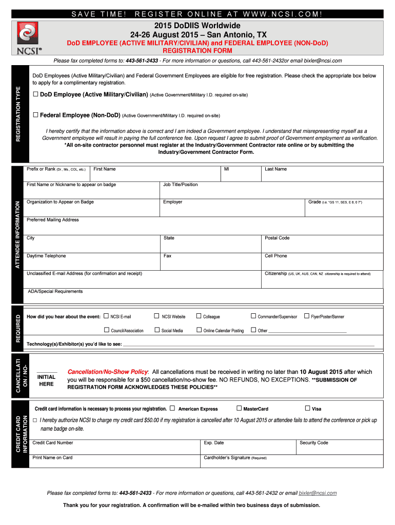 SAVE TIME! REGISTER ONLINE AT WWW.NCSI.COM! 2015 Bodies Worldwide 2426 August 2015 San Antonio, TX DoD EMPLOYEE (ACTIVE MILITARY/CIVILIAN) and FEDERAL EMPLOYEE (London) REGISTRATION FORM Please fax