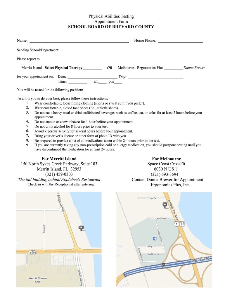 Physical Abilities Testing Appointment Form SCHOOL BOARD OF BREVARD COUNTY Name: Home Phone: Sending School/Department: Please report to Merritt Island Select Physical Therapy for your appointment