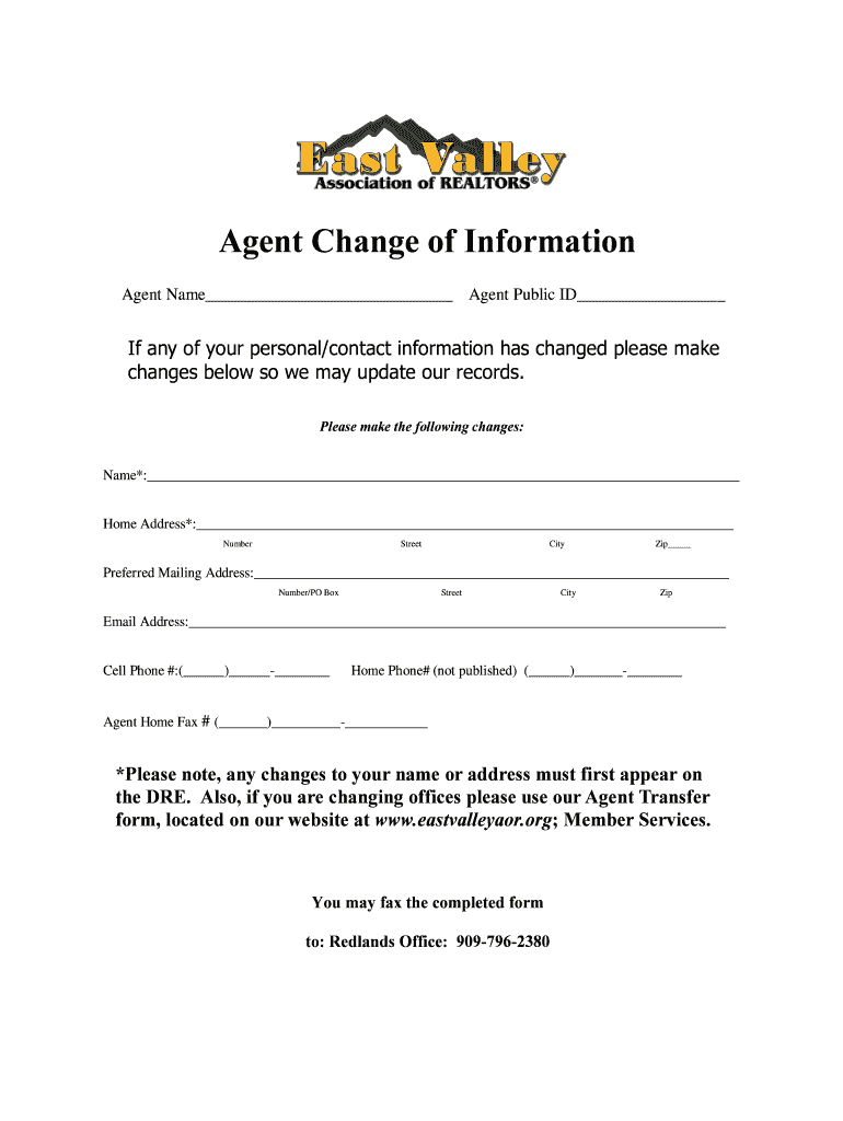 Get the free Agent change of info - East Valley Association of REALTORS - eastvalleyaor