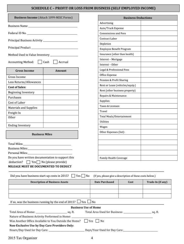 SCHEDULE C PROFIT OR LOSS FROM BUSINESS (SELF EMPLOYED INCOME) Business Income (Attach 1099MISC Forms) Advertising Business Name Auto/Truck Expense Federal ID No. Commissions and Fees Contract Labor