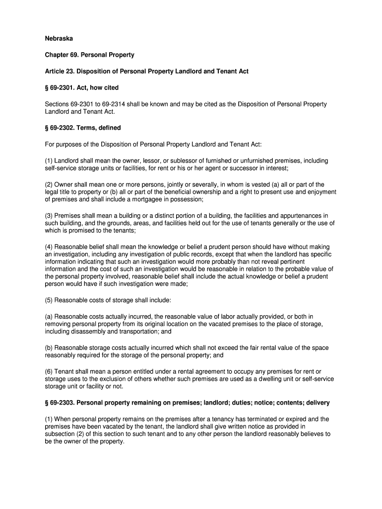 Nebraska Chapter 69. Personal Property Article 23. Disposition of Personal Property Landlord and Tenant Act 692301. Act, how cited Sections 692301 to 692314 shall be known and may be cited as the