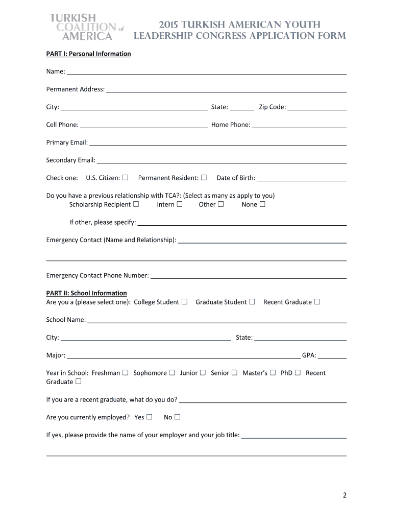 TURKISH AMERICAN YOUTH LEADERSHIP CONGRESS 2015 Application The Turkish Coalition of America (TCA) is accepting applications for the Second Annual Turkish American Youth Leadership Conference to be