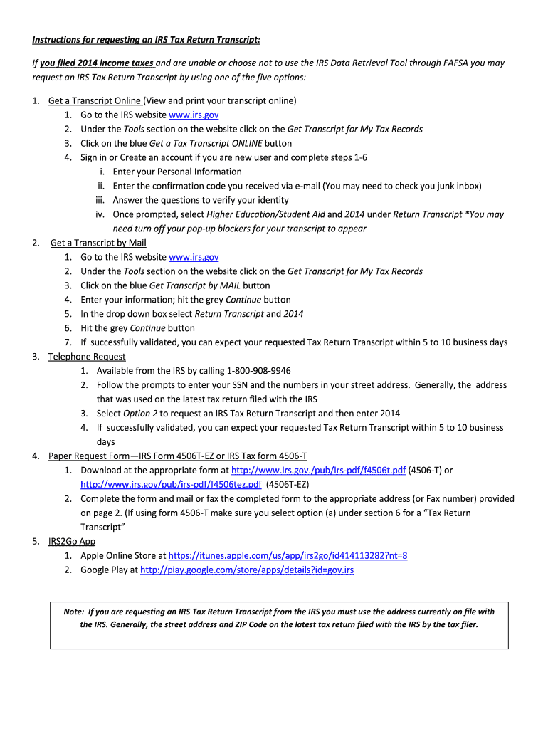 Instructions for requesting an IRS Tax Return Transcript: