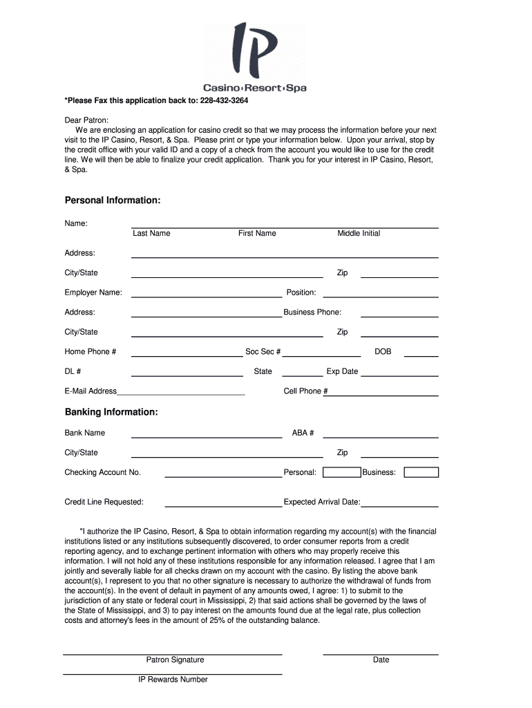 *Please Fax this application back to: 2284323264 Dear Patron: We are enclosing an application for casino credit so that we may process the information before your next visit to the IP Casino, Resort,