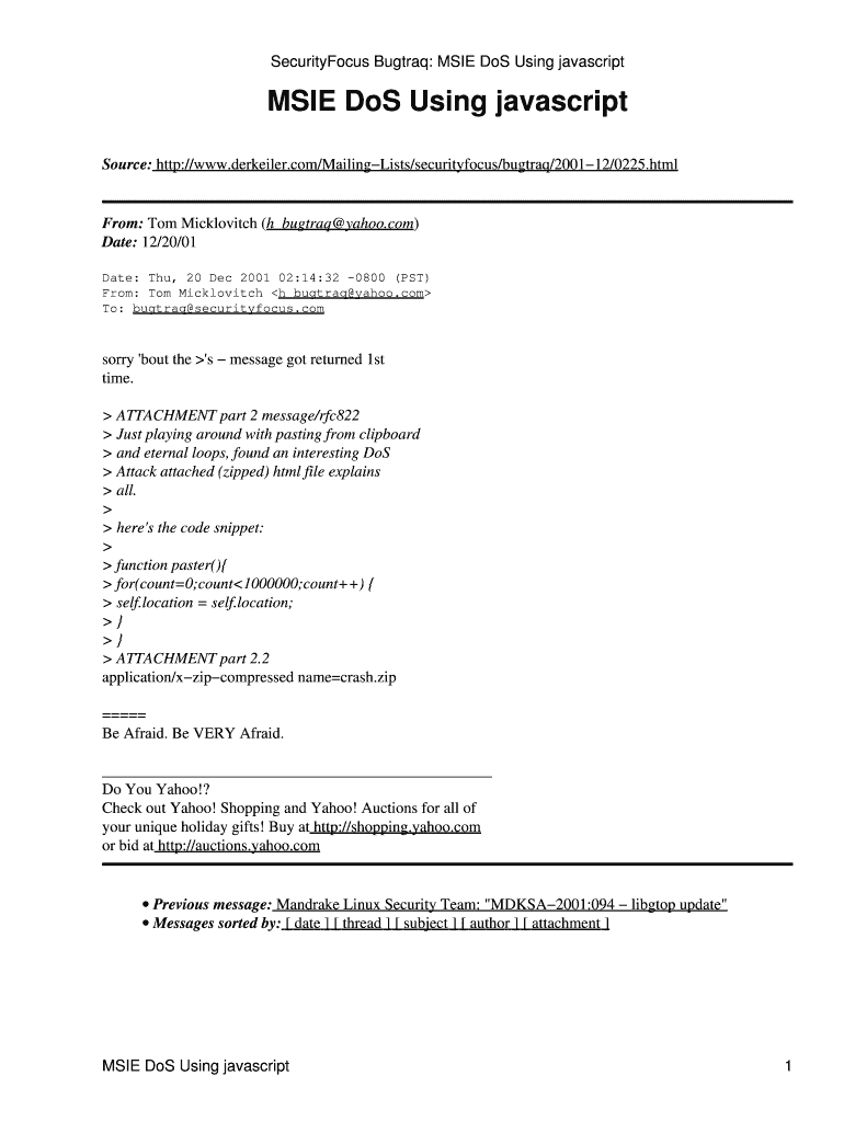 SecurityFocus Ultra: MSIE DoS Using JavaScript MSIE DoS Using JavaScript Source: http://www.derkeiler.com/Mailing? Lists/security focus/ultra/2001?12/0225.html From: Tom Micklovitch (h ultra yahoo.com)