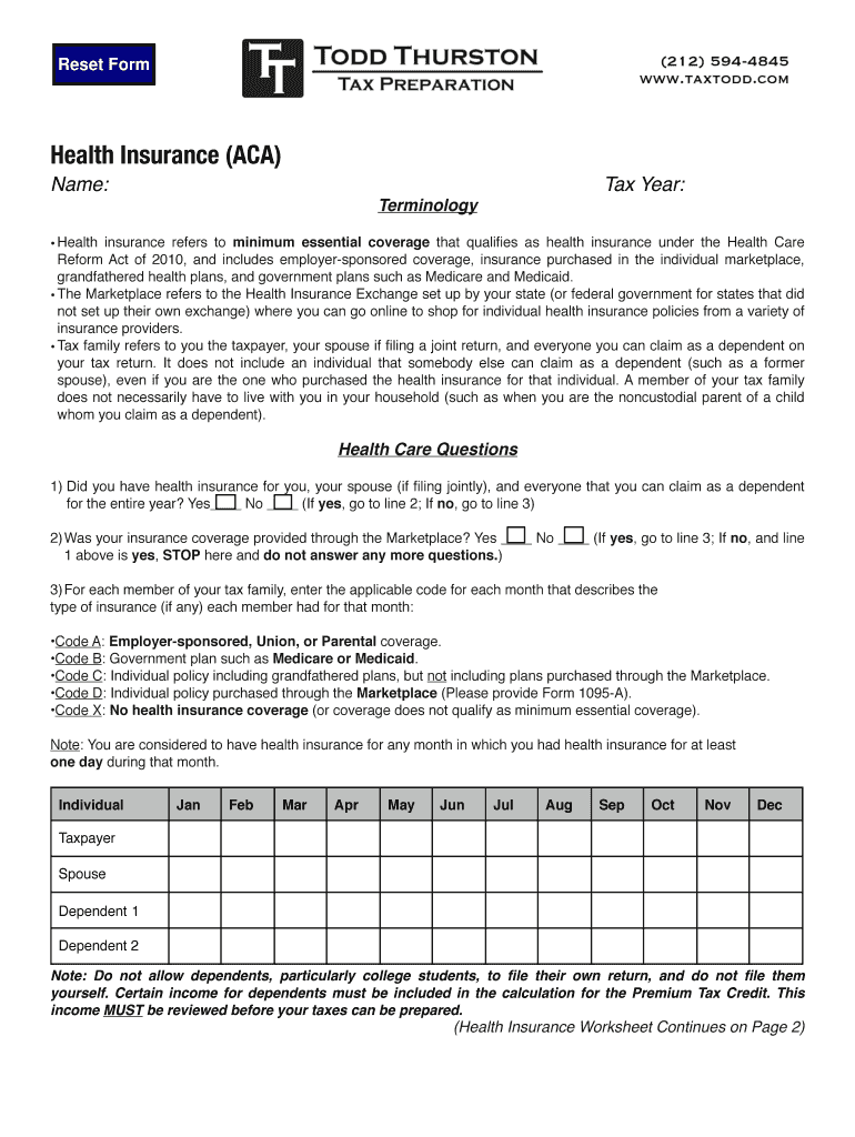 Reset Form Health Insurance (ACA) Name:! ! ! ! ! ! ! ! ! ! Tax Year: Terminology Health insurance refers to minimum essential coverage that qua lies as health insurance under the Health Care Reform
