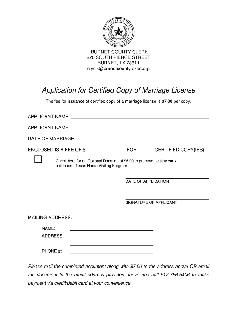 BURNED COUNTY CLERK 220 SOUTH PIERCE STREET Burnett, TX 78611 cycle burnetcountytexas.org Application for Certified Copy of Marriage License The fee for issuance of certified copy of a marriage license