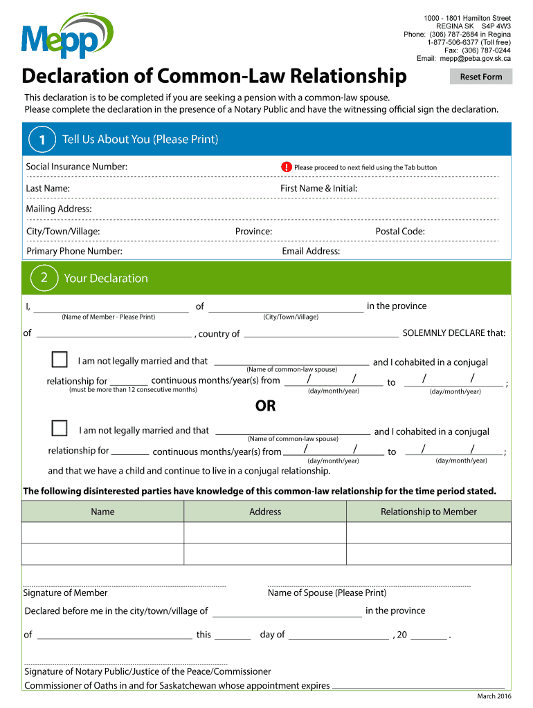 1000 1801 Hamilton Street REGINA SK S4P 4W3 Phone: (306) 7872684 in Regina 18775066377 (Toll free) Fax: (306) 7870244 Email: EPP PBA.gov.SK.ca Declaration of Commonly Relationship Reset Form This
